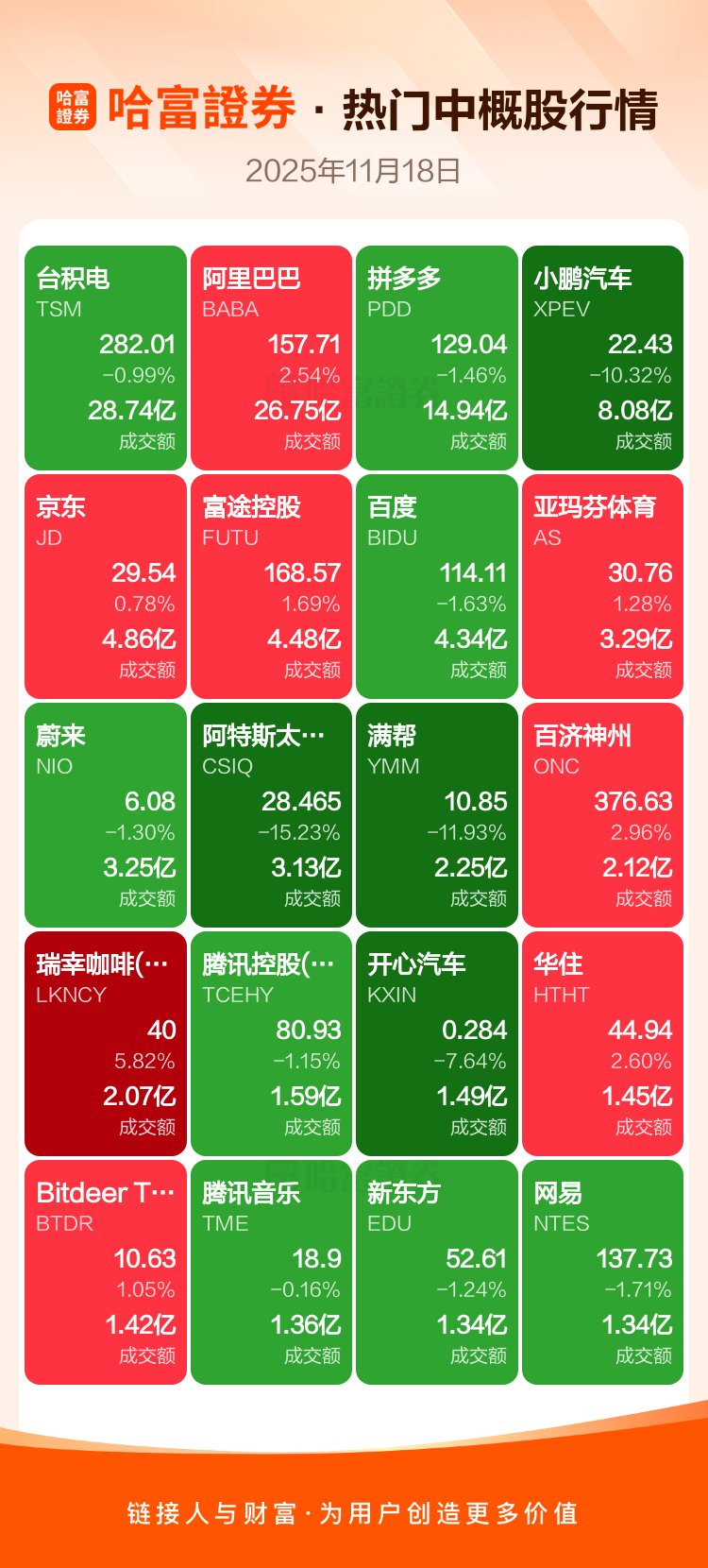 台积电跌0.99%,阿里巴巴涨2.54%,拼多多跌1.46%,小鹏汽车跌10.32%,京东涨0.78%,富途控股涨1.69%,百度跌1.63%,亚玛芬体育涨1.28%,蔚来跌1.30%,阿特斯太阳能跌15.23%。