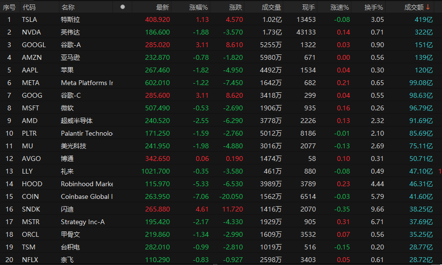 第2名英伟达收跌1.88%,成交318.45亿美元。英伟达将在周三收盘后公布财报,在此之前,美国证券交易委员会(SEC)公布的最新13F持仓文件显示,美国知名投资人彼得-蒂尔(Peter Thiel)旗下的基金Thiel Macro Fund第三季度出售了约53.7万股英伟达股票,占其投资组合的近40%。截至9月30日,该机构不再持有英伟达股份。