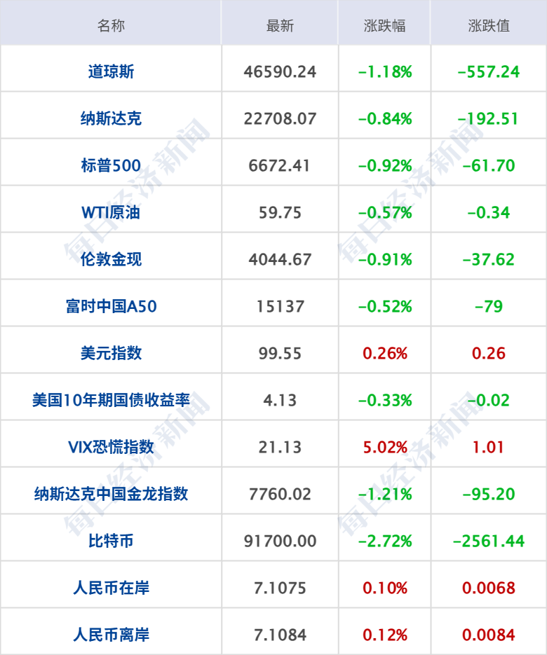 美股三大指数集体收跌,道指跌557点,跌幅1.18%,标普500指数跌0.92%,纳斯达克综合指数跌0.84%;大型科技股多数下跌,AMD、英特尔跌超2%,英伟达、苹果、甲骨文、Meta跌超1%,谷歌逆势涨超3%;黄金矿业股普跌,赫克拉矿业跌超4%,金田、哈莫尼黄金跌超3%;加密货币概念股走弱,Coinbase跌超7%,Circle跌超6%。中概股多数下跌,纳斯达克中国金龙指数跌1.21%,小鹏汽车跌超10%,理想汽车跌超4%,网易、百度、蔚来跌超1%,阿里巴巴涨超2%。
