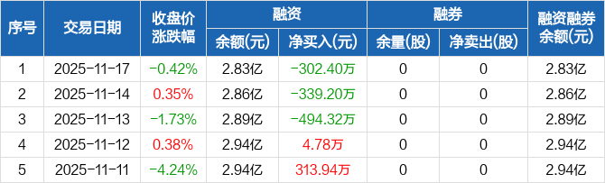 融资方面,当日融资买入3130.75万元,融资偿还3433.16万元,融资净偿还302.4万元,连续3日净偿还累计1135.93万元。融券方面,融券卖出0股,融券偿还0股,融券余量0股,融券余额0元。融资融券余额合计2.83亿元。
