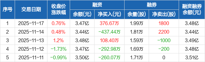 纳睿雷达融资融券信息显示,2025年11月17日融资净买入376.67万元;融资余额3.47亿元,较前一日增加1.1%