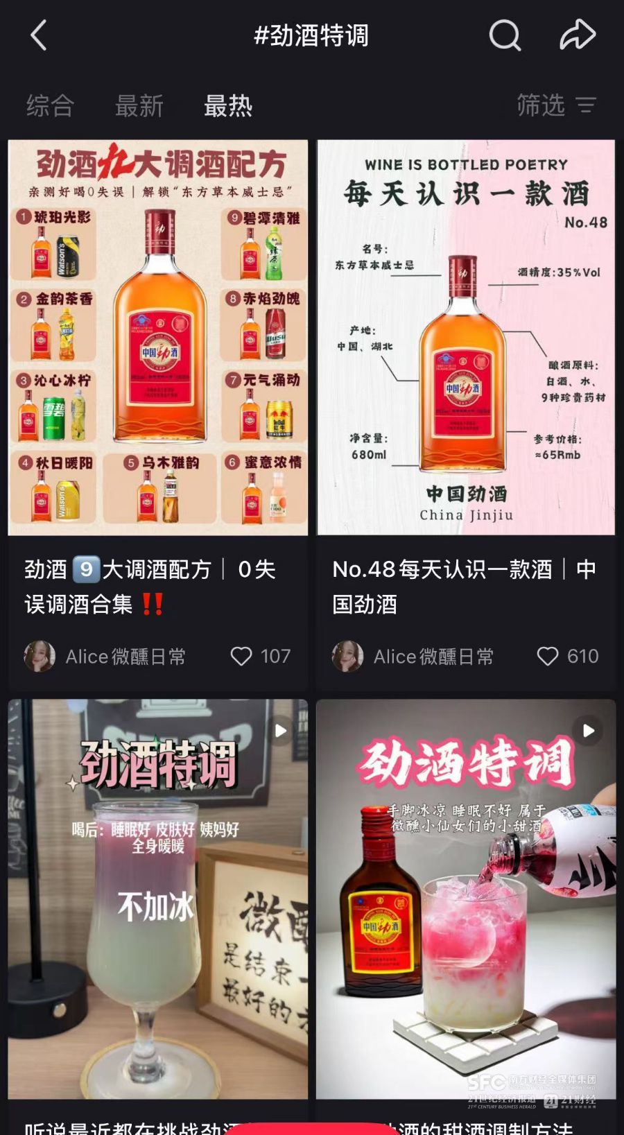 这一传播角度迅速引起女性用户共鸣,激发了平台上又一轮创意比拼,随后几个月内出现了“劲酒+红糖姜茶”“劲酒+旺仔牛奶”等2.0版配方。