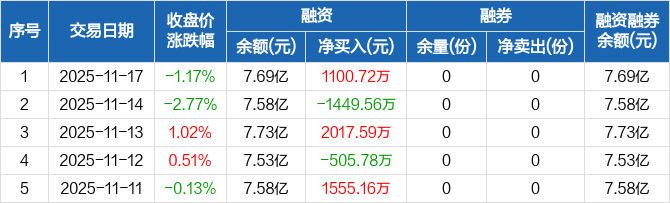 恒生科技ETF:融资净买入1100.72万元,融资余额7.69亿元(11-17)