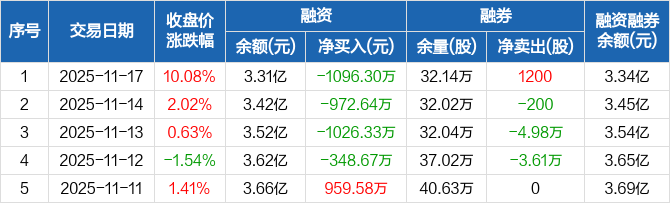 湖北广电融资融券信息显示,2025年11月17日融资净偿还1096.3万元;融资余额3.31亿元,较前一日下降3.2%