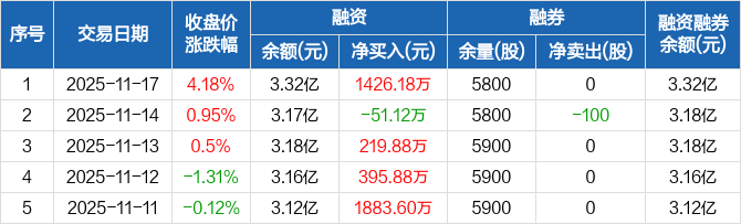 融资方面,当日融资买入4072.54万元,融资偿还2646.35万元,融资净买入1426.18万元。融券方面,融券卖出0股,融券偿还0股,融券余量5800股,融券余额14.73万元。融资融券余额合计3.32亿元。