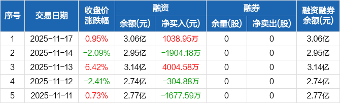 融资方面,当日融资买入4227.71万元,融资偿还3188.76万元,融资净买入1038.95万元。融券方面,融券卖出0股,融券偿还0股,融券余量0股,融券余额0元。融资融券余额合计3.06亿元。