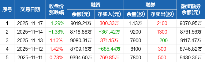 融资方面,当日融资买入1309.17万元,融资偿还1008.84万元,融资净买入300.33万元。融券方面,融券卖出2200股,融券偿还100股,融券余量1.13万股,融券余额51.74万元。融资融券余额合计9070.95万元。