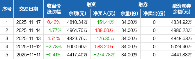 新能源ETF:融资净偿还151.41万元,融资余额4810.34万元(11-17)