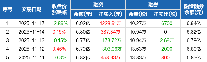 融资方面,当日融资买入2463.01万元,融资偿还1234.1万元,融资净买入1228.91万元。融券方面,融券卖出900股,融券偿还7600股,融券余量10.27万股,融券余额131.25万元。融资融券余额合计6.94亿元。