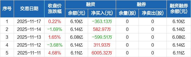 融资方面,当日融资买入3508.01万元,融资偿还3871.13万元,融资净偿还363.13万元。融券方面,融券卖出0股,融券偿还0股,融券余量0股,融券余额0元。融资融券余额合计6.1亿元。