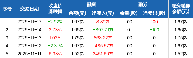 融资方面,当日融资买入5983.16万元,融资偿还5974.27万元,融资净买入8.89万元。融券方面,融券卖出100股,融券偿还0股,融券余量100股,融券余额1594元。融资融券余额合计1.67亿元。