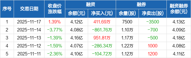 融资方面,当日融资买入4260.16万元,融资偿还3848.47万元,融资净买入411.69万元。融券方面,融券卖出100股,融券偿还3600股,融券余量7500股,融券余额77.11万元。融资融券余额合计4.13亿元。