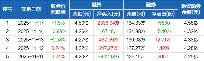中国广核融资融券信息显示,2025年11月17日融资净买入2336.94万元;融资余额4.5亿元,较前一日增加5.48%。