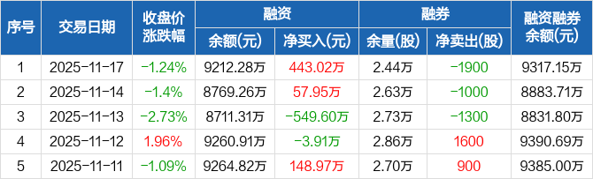 融资方面,当日融资买入878.76万元,融资偿还435.74万元,融资净买入443.02万元。融券方面,融券卖出200股,融券偿还2100股,融券余量2.44万股,融券余额104.87万元。融资融券余额合计9317.15万元。