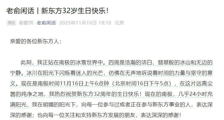 信中提到,“此刻,我正站在南极的冰雪世界中。四周是浩瀚的洁白、翡翠般的冰山和无边的宁静。冰川在阳光下闪烁着迷人的光芒,仿佛在无声地诉说着时间的力量与坚守的意义。现在是南极时间11月16日上午6点钟(北京时间16日下午5点),在这片远离尘嚣的纯净之地,我热烈祝贺新东方32周年的生日快乐!”