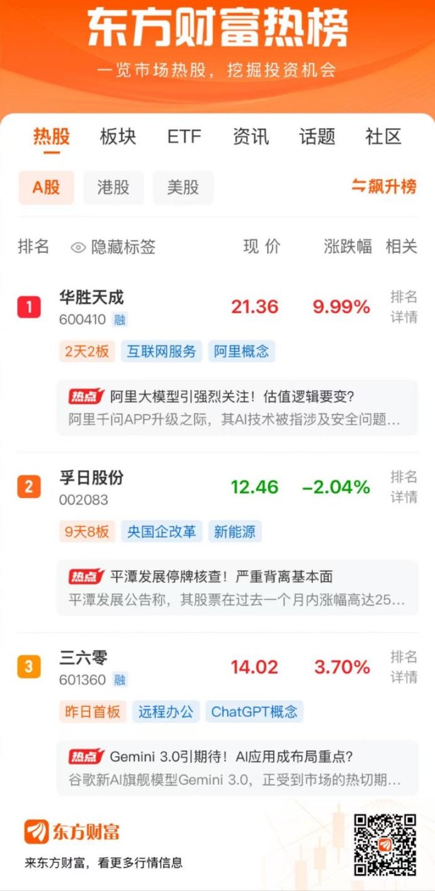 11月18日,两市延续调整,三大指数均跌约1%。东方财富热股榜前三的股票中,华胜天成位列第1,孚日股份位列第2,三六零位列第3。