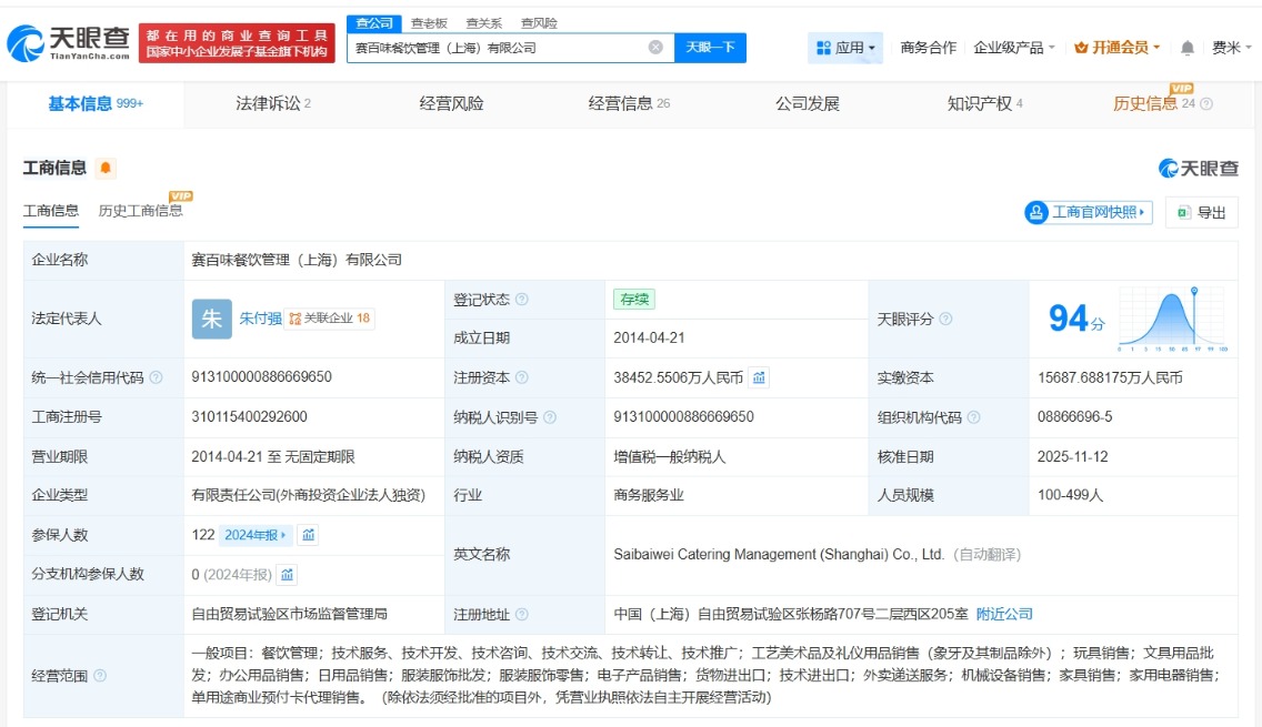 每经AI快讯,天眼查工商信息显示,近日,赛百味餐饮管理(上海)有限公司发生工商变更,注册资本由约3.2亿元人民币增至约3.8亿元人民币,增幅约21%。赛百味餐饮管理(上海)有限公司成立于2014年4月,法定代表人为朱付强,经营范围包括餐饮管理、工艺美术品及礼仪用品销售、玩具销售等。股东信息显示,该公司由上海富瑞食企业发展有限公司全资持股。