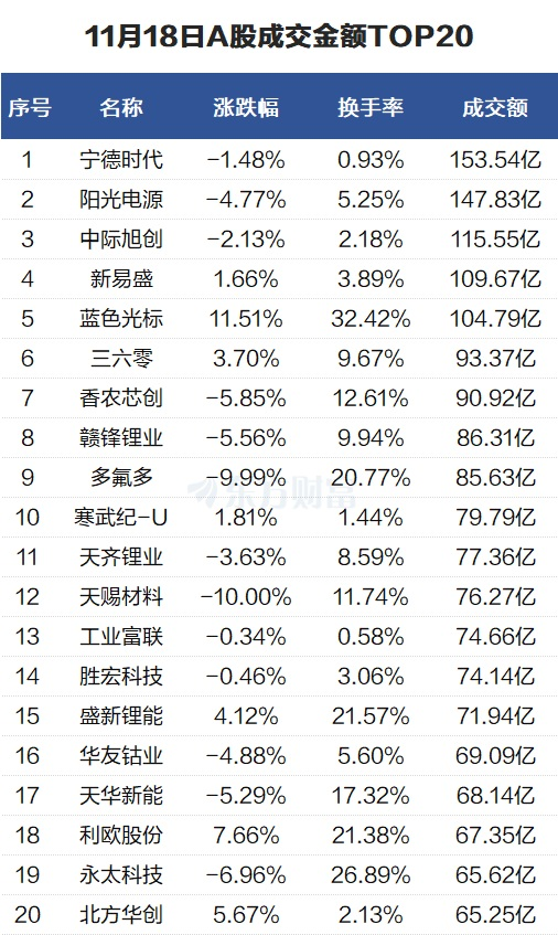 活跃个股:宁德时代成交154亿元 N北矿换手率88%