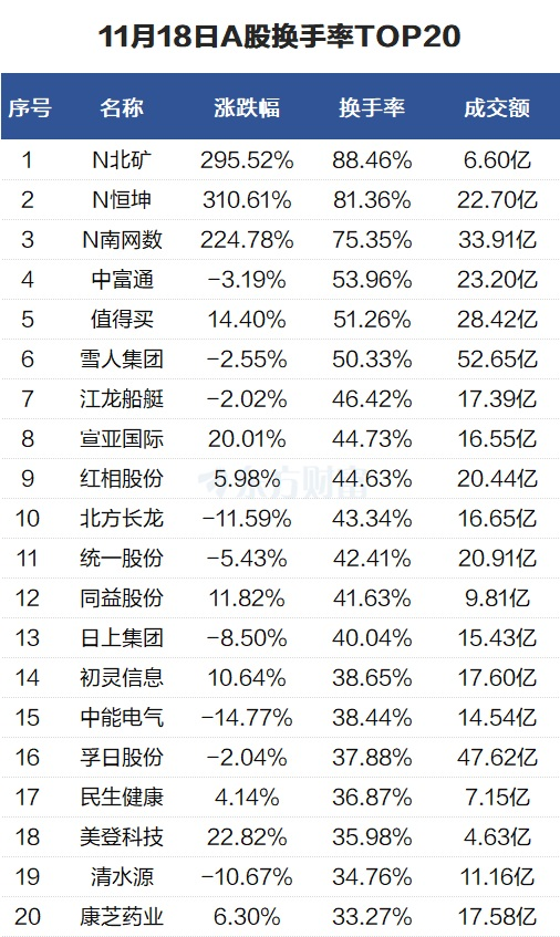 当天换手率最高的个股为N北矿,全天换手率88.46%。N恒坤紧随其后,全天换手率81.36%。