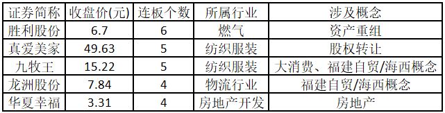 从连板情况来看,今日首板个股有28只;2连板的个股有8只;3连板及以上的个股有9只。今日连板数排名前5的个股包括胜利股份、真爱美家、九牧王、龙洲股份、华夏幸福,具体如下表所示。