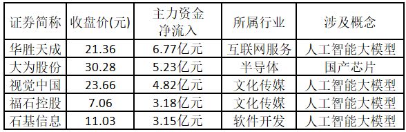 从主力资金来看,今日涨停板个股中,主力资金净流入金额排名前5的个股分别为华胜天成、大为股份、视觉中国、福石控股、石基信息。