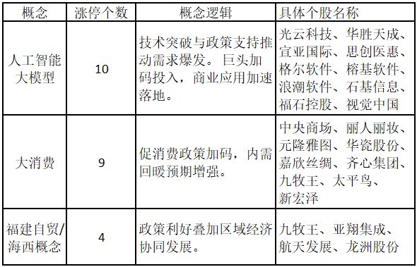 从概念特征来看,今日涨停板个股中,人工智能大模型、大消费、福建自贸/海西概念的个股最多。