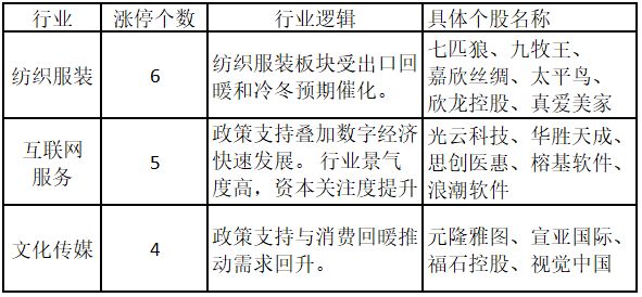 从行业特征来看,今日涨停板个股中,纺织服装、互联网服务、文化传媒行业的个股最多。
