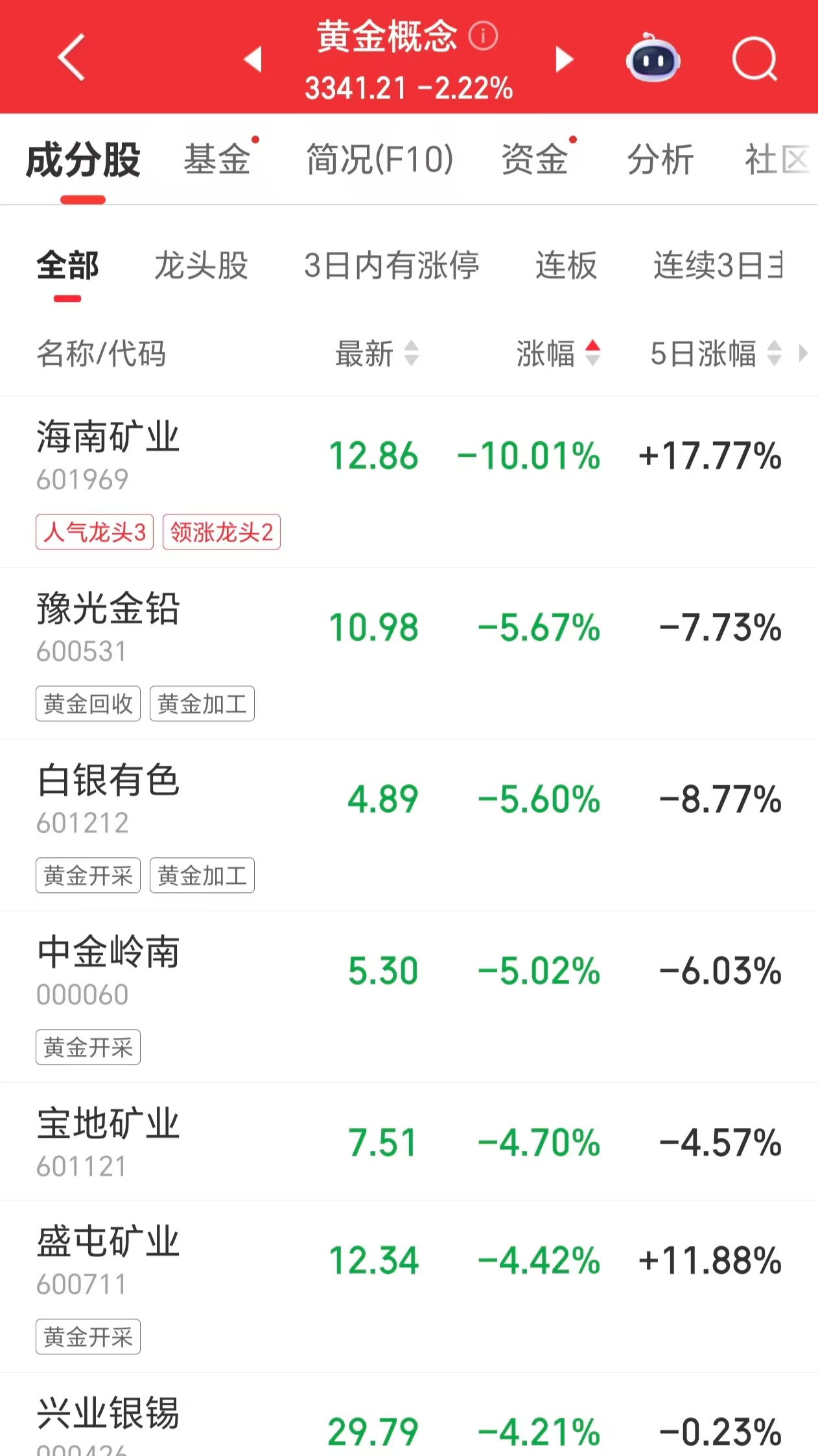 同日,国内黄金概念板块集体走跌。截至收盘,海南矿业跌停,豫光金铅、白银有色、中金岭南等跌幅超5%,宝地矿业、盛屯矿业、兴业银锡、湖南白银等跟跌。
