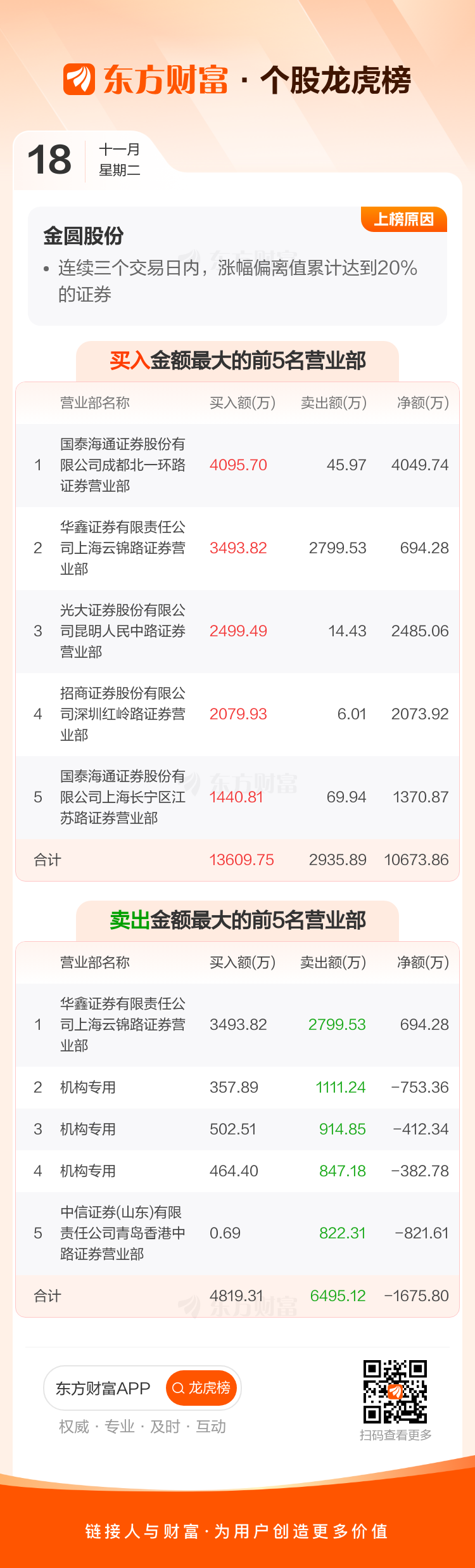交易所2025年11月18日公布的交易公开信息显示,金圆股份因成为连续三个交易日内,涨幅偏离值累计达到20%的证券上榜。金圆股份当日收报6.91元,涨跌幅10.03%,换手率7.99%,成交额3.84亿。异常期间11月17日至11月18日,期间涨幅21.02%,累计偏离值22.04%,区间成交额6.22亿。
