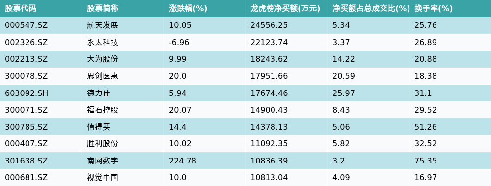 南财智讯11月18日电,南财金融终端数据显示,因当日异动登上龙虎榜的个股中,资金净买入最多的前三位分别是航天发展(000547.SZ)、永太科技(002326.SZ)与大为股份(002213.SZ)。其中排名第一的航天发展净买额达2.46亿元,占总成交金额的5.34%。航天发展当日收盘上涨10.05%,换手率为25.76%,净买入额前10个股详情见下图: