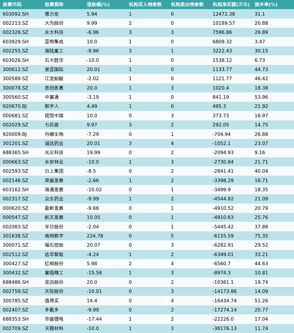 南财智讯11月18日电,南财金融终端数据显示,因当日异动登上龙虎榜的个股中,35只沪深A股龙虎榜出现了机构的身影,机构合计净卖出141995.39万元,具体来看,机构净买入13只个股,净卖出22只个股。其中,机构净买入前三分别为德力佳(603092.SH)、大为股份(002213.SZ)与永太科技(002326.SZ),详情见下图:机构净卖出的个股中,前三分别为天赐材料(002709.SZ)、华盛锂电(688353.SH)与多氟多(002407.SZ)。
