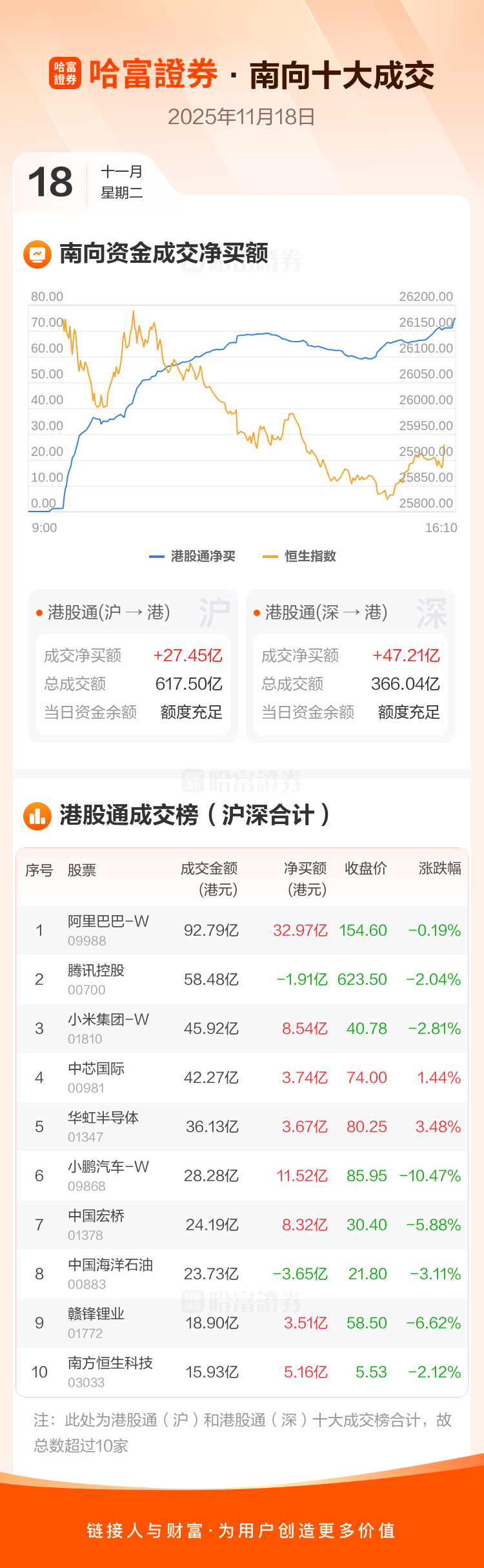 南向十大成交股中,阿里巴巴-W、小鹏汽车-W、小米集团-W分别获净买入32.97亿港元、11.52亿港元、8.54亿港元。中国海洋石油、腾讯控股分别遭净卖出3.65亿港元、1.91亿港元。