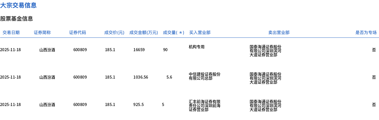 11月18日,山西汾酒大宗交易成交100.6万股,成交额1.86亿元,占当日总成交额的14.7%,成交价185.1元,较市场收盘价196.91元折价6%。