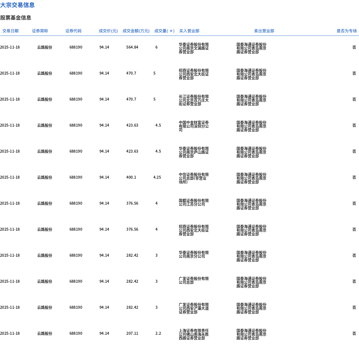 云路股份今日大宗交易折价成交62.95万股,成交额5926.12万元