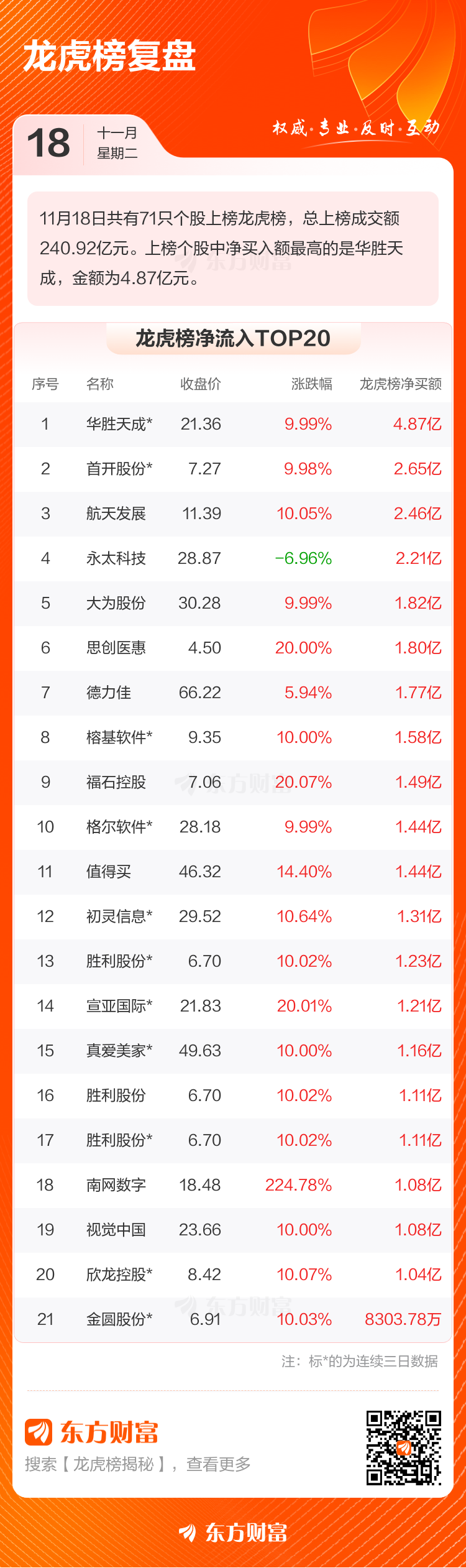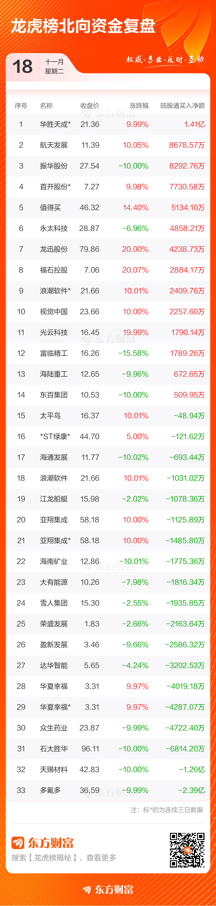 11月18日龙虎榜复盘:“陈小群”1.84亿元净买入航天发展