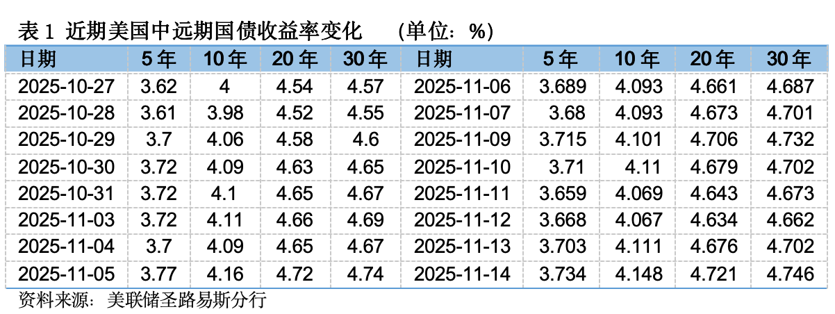 美联储10月末议息会议之后,美国中长期利率表现较为坚挺。5年期、10年期、20年期、30年期的国债利率分别由10月30日(收盘利率)的3.72%、4.09%、4.63%、4.65%升至11月17日的3.721%、4.133%、4.707%、4.736%,充分反映了投资者减息预期降温:美联储下个月降息几率较低,甚至有不少基金经理呼吁美联储向市场输入更多的流动性。