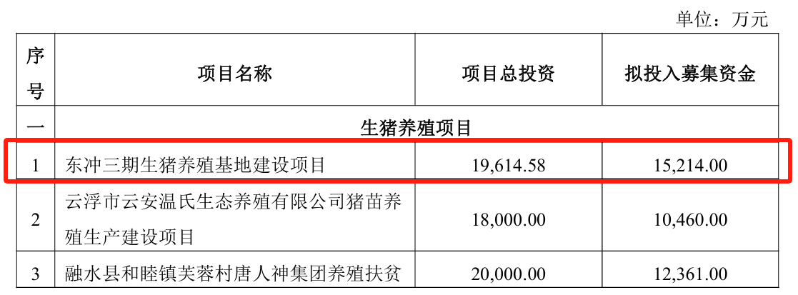 据公告,唐人神于2022年通过非公开发行股票募集资金,实际募集资金总额为11.40亿元,扣除发行费用后净额为11.12亿元,上述资金已全部到位并专户存储。该笔募集资金原计划投向东冲三期生猪养殖基地建设项目、云浮市云安温氏生态养殖有限公司猪苗养殖生产建设项目等6大项目。