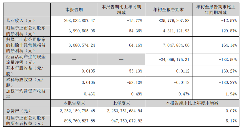 10月26日,集泰股份公布2025年三季报,公司前三季实现营业收入8.26亿元,同比下降12.57%;归母净利润亏损431万元,同比下降129.87%;扣非归母净利润亏损705万元,同比下降164.14%;经营现金流净额为-2407万元,同比下降133.50%。其中第三季度,公司营业收入2.93亿元,同比下降15.77%;归母净利润399万元,同比下降54.36%;扣非归母净利润为308万元,同比下降64.16%。