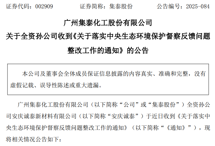 11月18日晚间,集泰股份(002909)公告称,公司全资孙公司安庆诚泰新材料有限公司近日收到《关于落实中央生态环境保护督察反馈问题整改工作的通知》(以下简称《通知》)。