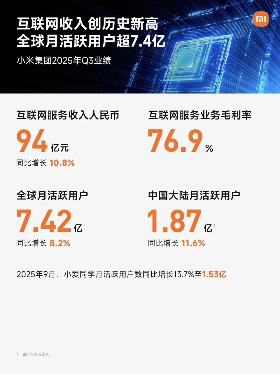互联网服务业务持续保持健康增长,用户规模持续扩大。三季度小米互联网服务业务收入达94亿元,同比增长10.8%,创历史新高,毛利率达到76.9%。截至2025年9月,小米全球月活跃用户数达7.42亿,中国大陆月活跃用户达1.87亿,均创历史新高。