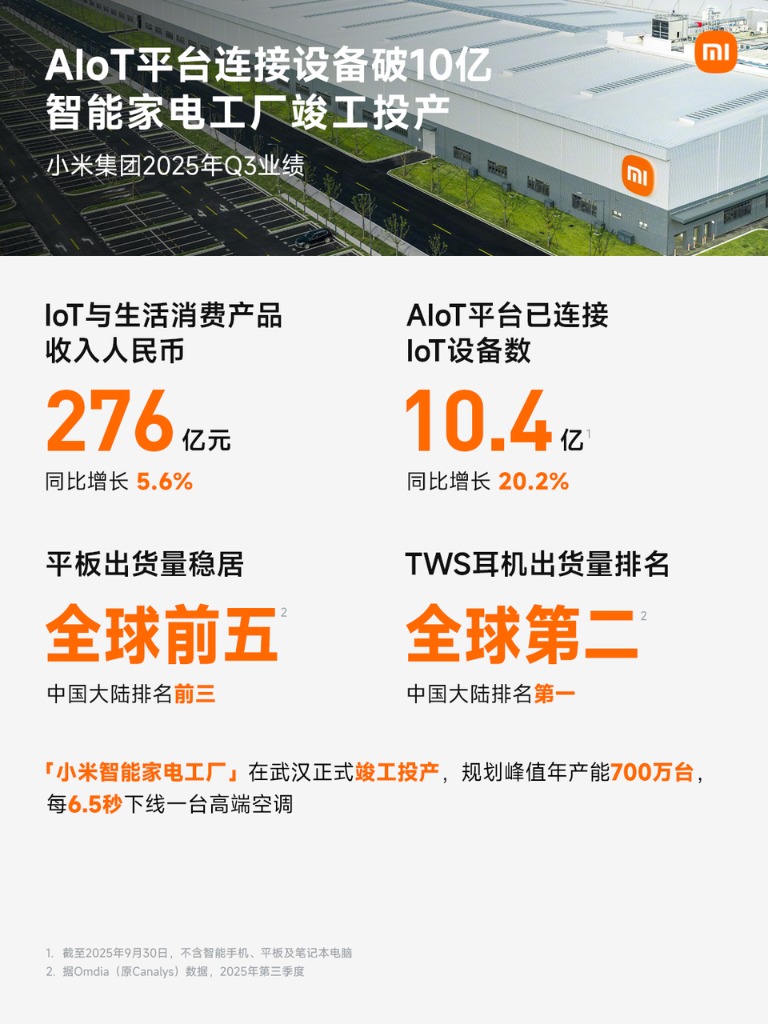 IoT与生活消费产品业务稳步增长,智能生态优势再扩大。报告期内,该板块收入276亿元,同比增长5.6%。截至今年9月30日,小米AIoT平台已连接IoT设备数突破10亿台,创历史新高;拥有五件及以上连接至AIoT平台的设备用户数达到2160万,同比增长26.1%。