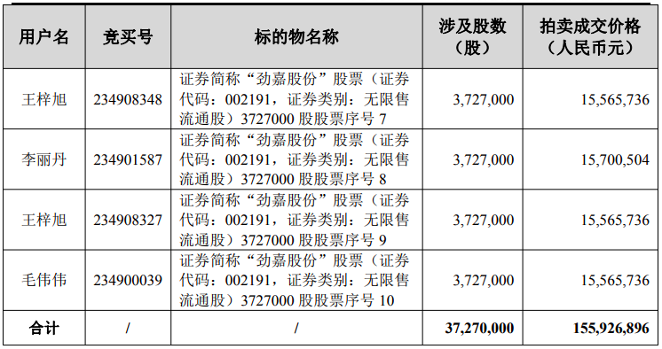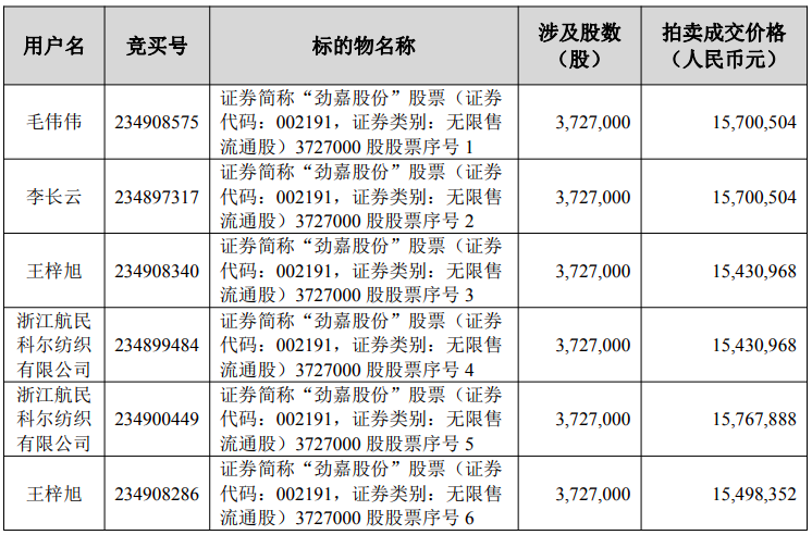 劲嘉股份(002191)11月18日晚间公告称,公司控股股东深圳市劲嘉创业投资有限公司(以下简称“劲嘉创投”或“控股股东”)持有的3727万股股份(占公司总股本2.57%)于2025年11月17日~18日在京东网司法拍卖平台完成拍卖,拍卖成交金额合计1.56亿元。