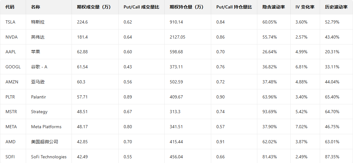 美股引申波动幅度排行榜前十(标的市值>100亿美元,且期权成交量>10万张)