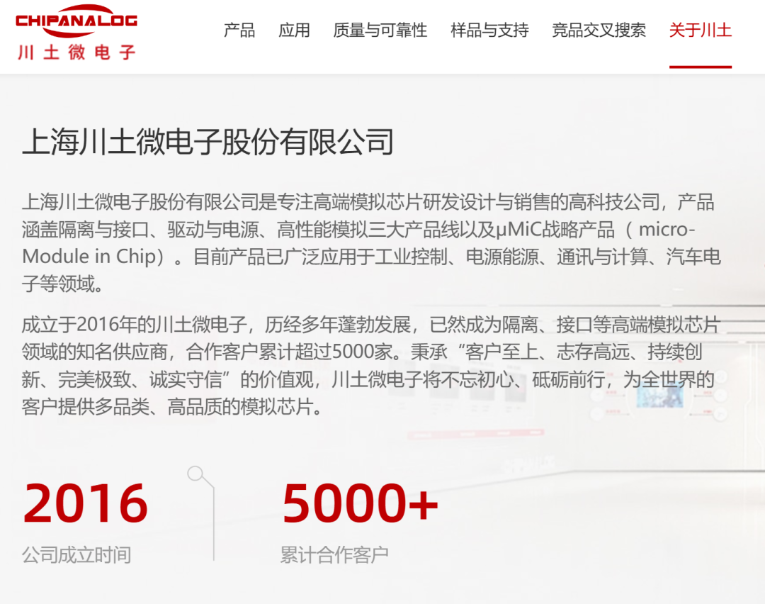 官网显示,川土微电子成立于2016年,是一家专注高端模拟芯片研发设计与销售的高科技公司,产品涵盖隔离与接口、驱动与电源、高性能模拟三大产品线以及μMiC战略产品(micro-Module in Chip)。目前产品已广泛应用于工业控制、电源能源、通讯与计算、汽车电子等领域,合作客户累计超过5000家。