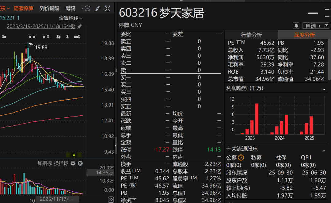 值得注意的是,该转让价格高于梦天家居停牌前最后一个交易日(11月5日)的收盘价,即15.70元/股。