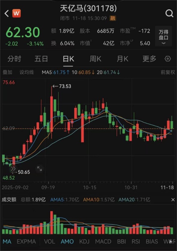 截至11月18日收盘,天亿马报62.3元/股,下跌3.14%;最新总市值为42亿元。