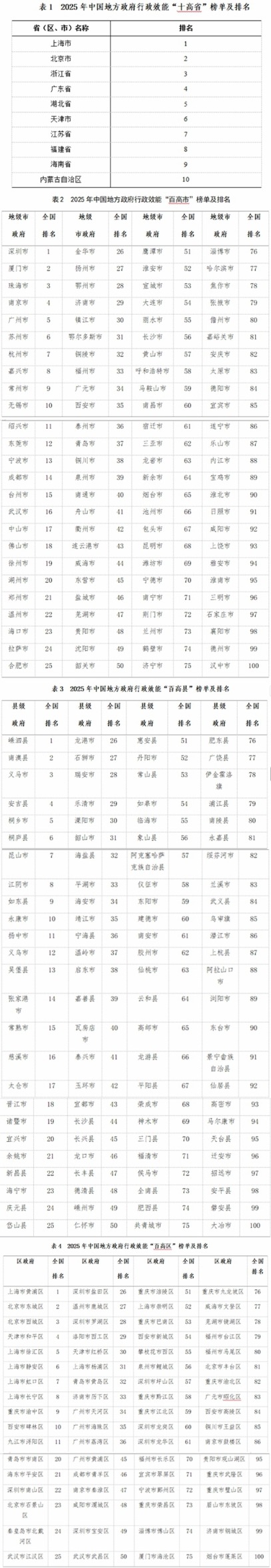 《报告》公布了中国省级政府行政效能排名前10的省份(简称“十高省”)、中国地级市政府(含地级市、地区、自治州、盟)行政效能排名前100的地级市政府(简称“百高市”)、中国县级政府(不含市辖区)行政效能排名前100的县级政府(简称“百高县”)以及中国市辖区政府行政效能排名前100的市辖区政府(简称“百高区”)。