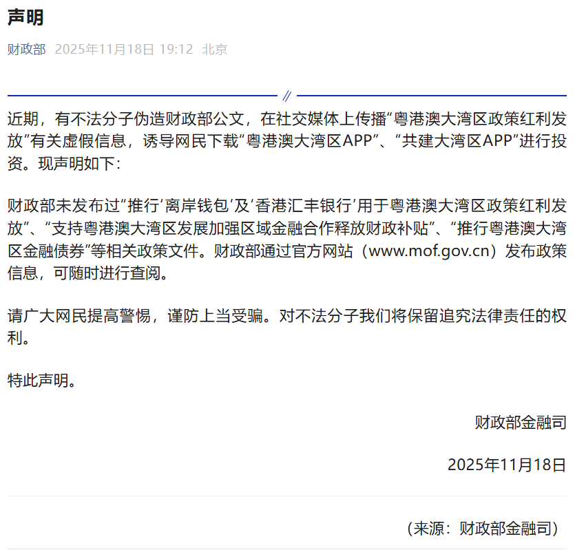 11月18日晚间,财政部在官方微信公众号发布声明表示,近期,有不法分子伪造财政部公文,在社交媒体上传播“粤港澳大湾区政策红利发放”有关虚假信息,诱导网民下载“粤港澳大湾区APP”、“共建大湾区APP”进行投资。现声明如下: