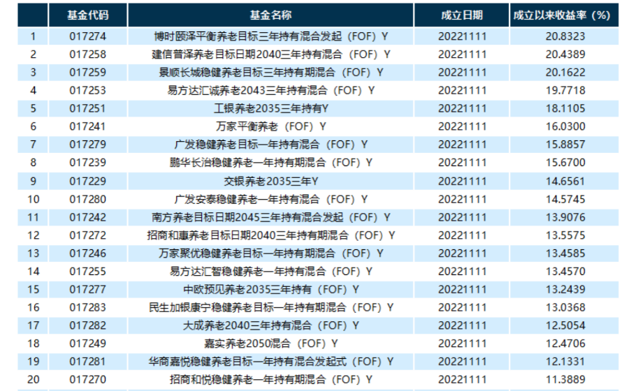 具体来看,截至11月17日,博时颐泽平衡养老三年持有(FOF)Y、建信普泽养老目标日期2040三年持有(FOF)Y、景顺长城稳健养老目标三年持有(FOF)Y自成立以来的回报率分别为20.83%、20.44%、20.16%。