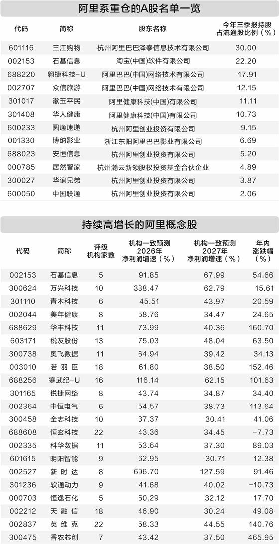 据证券时报·数据宝统计,阿里概念中,有21只个股有望持续高成长,机构一致预测2026年、2027年净利润增速均超30%且评级机构数在5家以上。其中,石基信息、万兴科技、新时达、寒武纪-U等个股机构一致预测明后两年净利润增速均有望超50%。